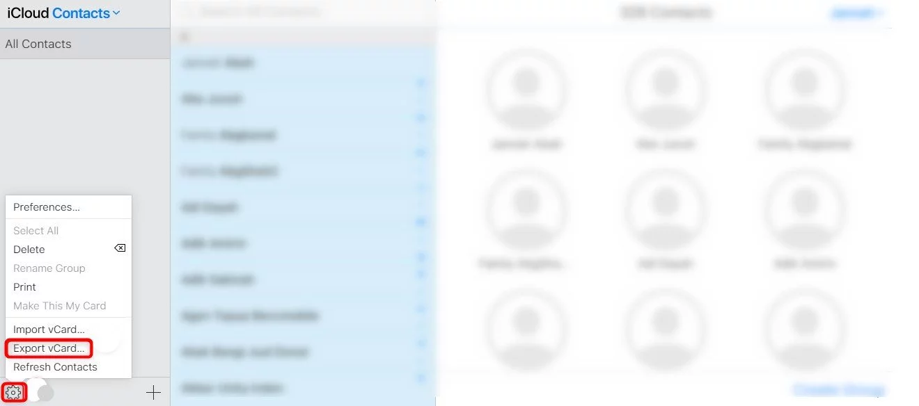 Setelah contacts siap dipilih, klik ikon setting sekali lagi dan pilih Export vCard.
