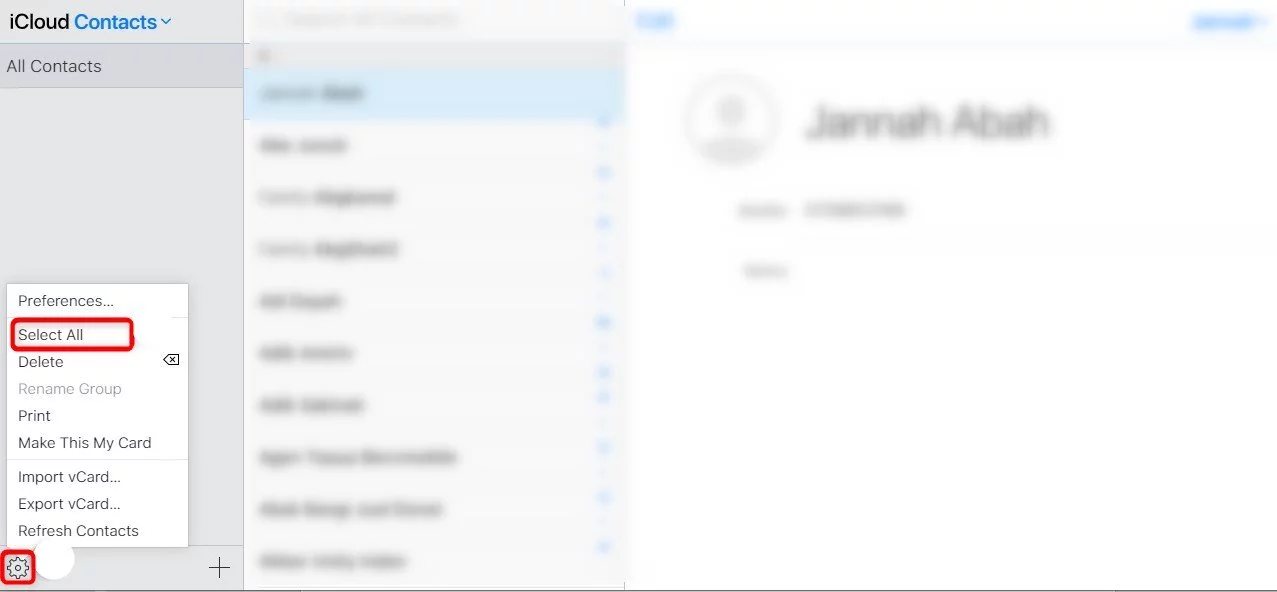 Pada paparan Contacts, klik ikon Setting di sebelah kiri bawah dan pilih Select All.