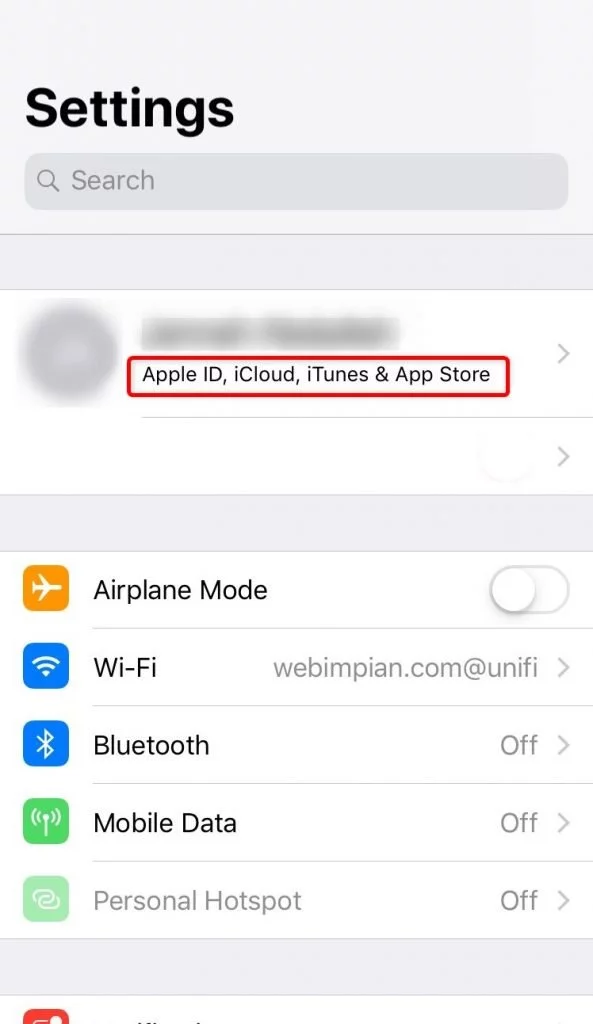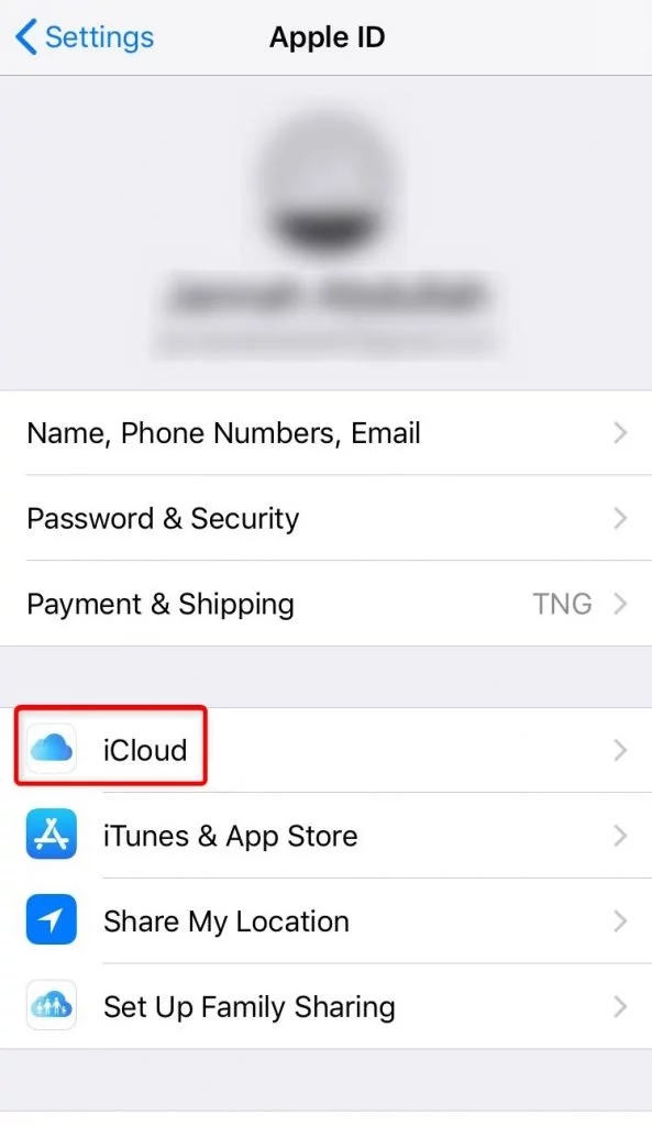 Pilih Settings pada iPhone anda. Tekan Your Name kemudian tekan iCloud.